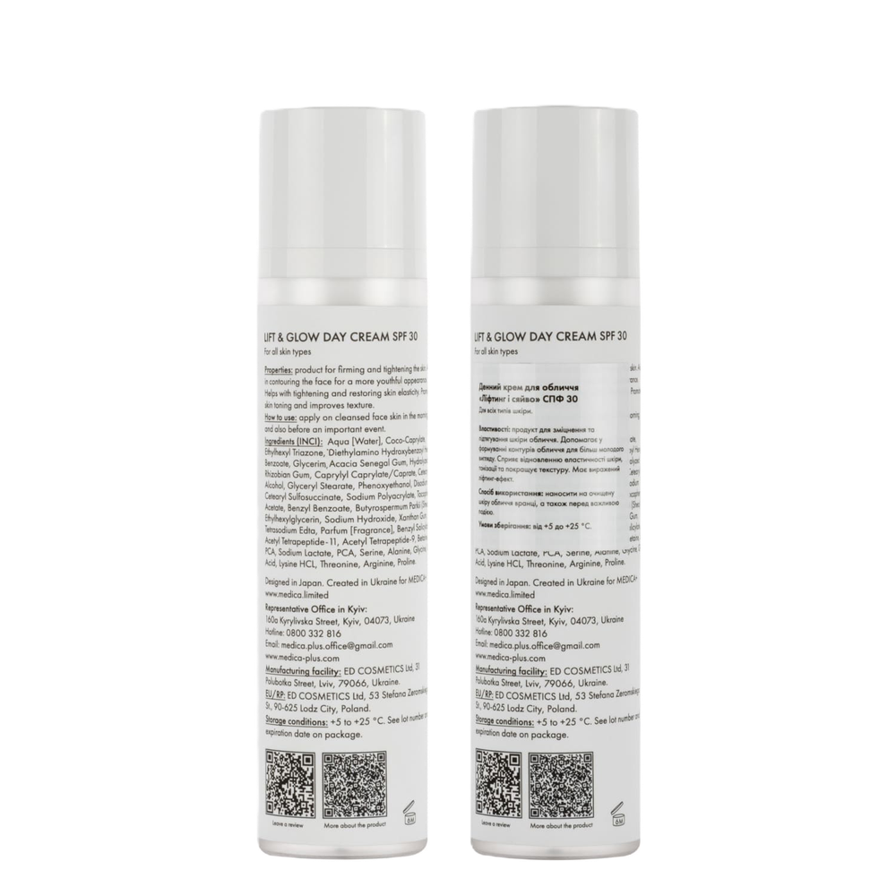 LIFT & GLOW Day Cream SPF 30 – многофункциональный дневной крем с выраженным лифтинг-эффектом, который сочетает интенсивное увлажнение, питание и защиту от ультрафиолета. Разработан для женщин, стремящихся сохранить свежесть, тонус и упругость кожи каждый день.