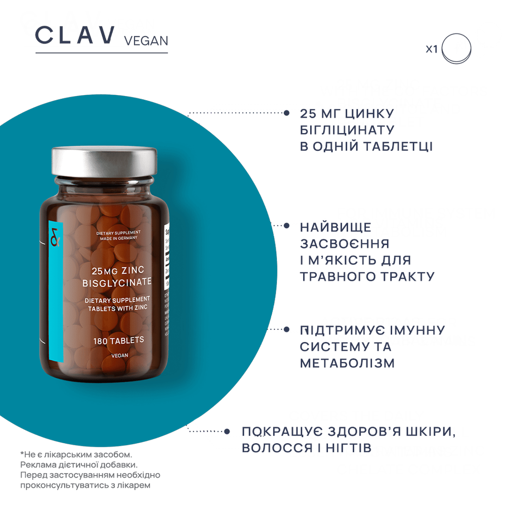 Диетическая добавка в форме таблеток, содержащая цинк в хелатной форме — бисглицинате, отличающемся высокой биодоступностью и мягким воздействием на желудок. Цинк — незаменимый микроэлемент, который организм не способен синтезировать самостоятельно. Он участвует более чем в 300 ферментативных реакциях и необходим для: нормального заживления ран и деления клеток; регуляции уровня сахара в крови и обмена углеводов, белков и жирных кислот; поддержания иммунной функции и защиты клеток от окислительного стресса; сохранения фертильности, здоровья кожи, волос и ногтей. Форма бисглицината цинка обеспечивает оптимальное усвоение и лучшую переносимость по сравнению с другими солями цинка.