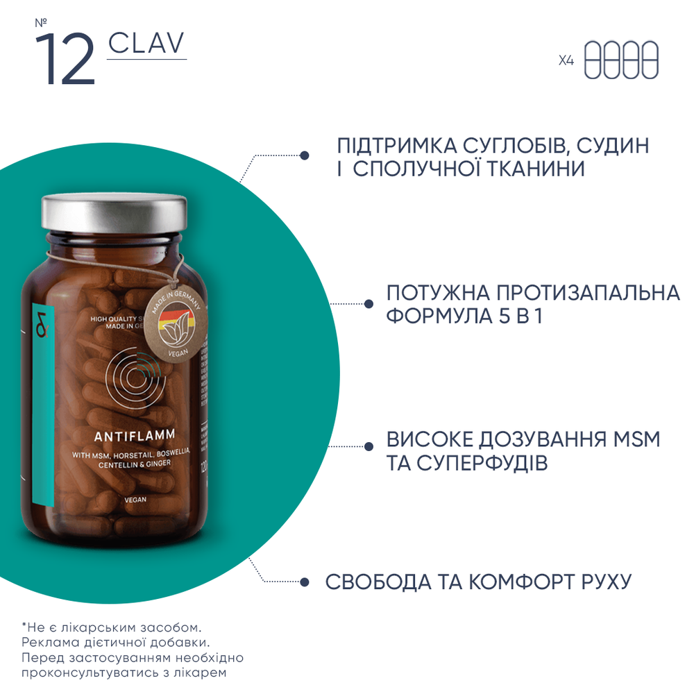 CLAV ANTIFLAMM — это пример «умной нутрицевтики»: контроль воспаления без блокирования физиологических процессов, поддержание структуры суставов и сохранение активности в любом возрасте.