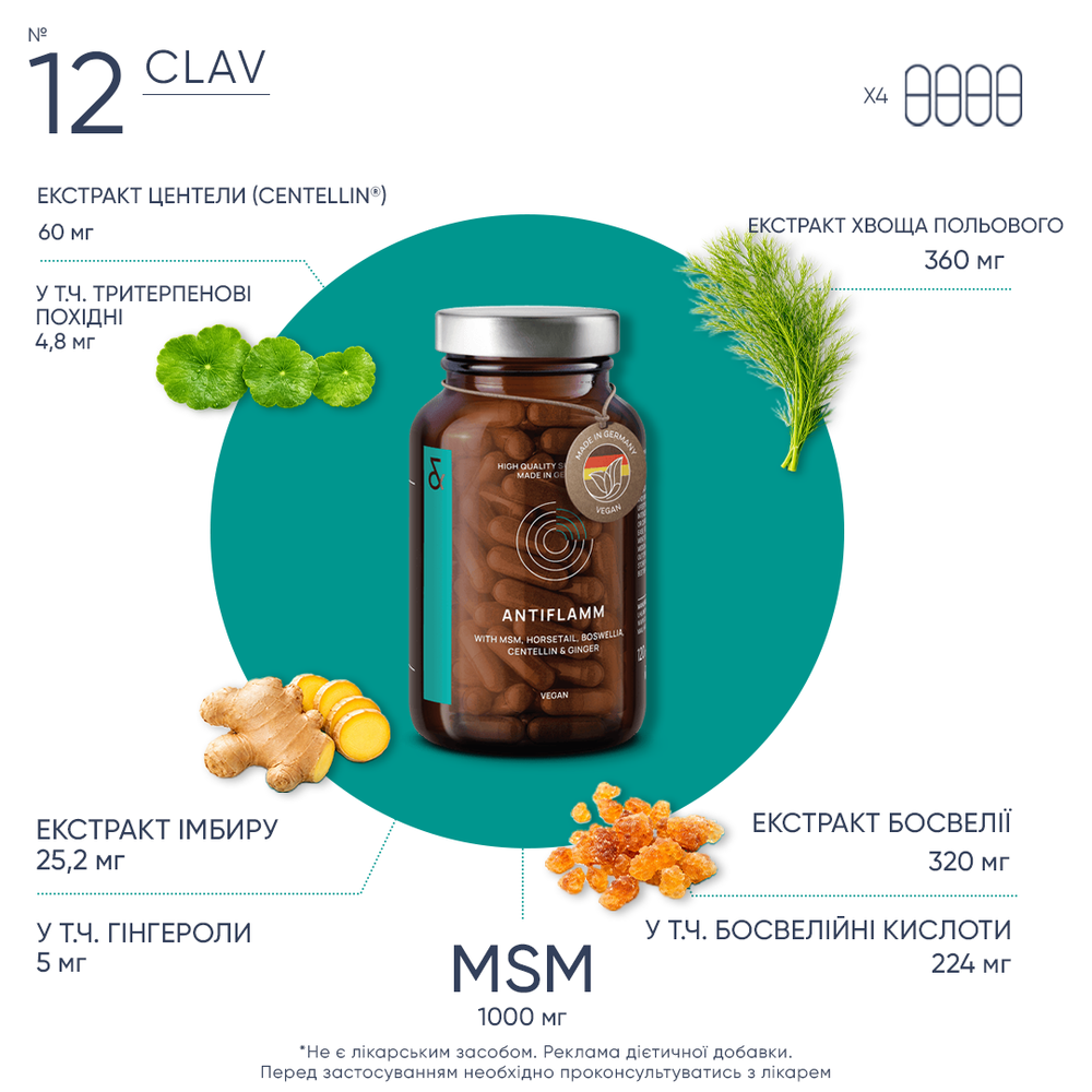 Диетическая добавка в форме капсул. Воспаление является нормальным процессом в организме. Иммунная система вызывает воспалительную реакцию, когда патогены попадают в организм, с целью их удаления. CLAV ANTIFLAMM — это многокомпонентный нутрицевтический комплекс растительного происхождения, разработанный для контроля воспалительных процессов, поддержания здоровья суставов, связок и соединительной ткани, а также для уменьшения болевого синдрома и отеков, связанных с хроническим или функциональным воспалением.