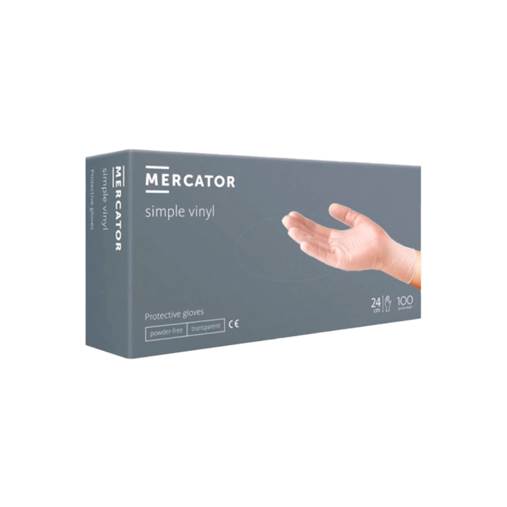 Перчатки виниловые Merkator simple vinyl powder free, н/о н/с, прозрачные. В упаковке 100 шт.