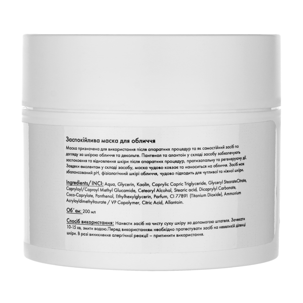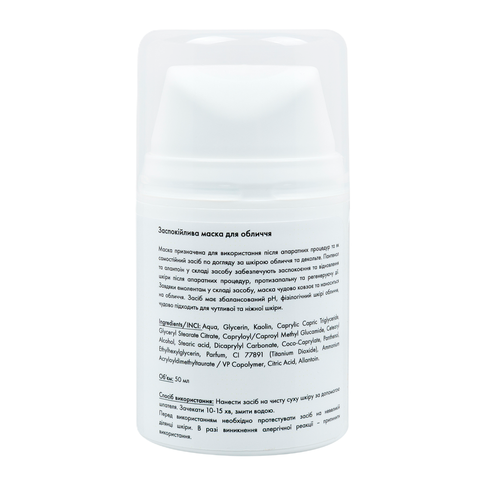 Маска предназначена для ухода за кожей лица и декольте после аппаратных процедур, а также как самостоятельное средство. Пантенол и аллантоин в составе обеспечивают успокаивающее и восстанавливающее действие, оказывая противовоспалительное и регенерирующее влияние.