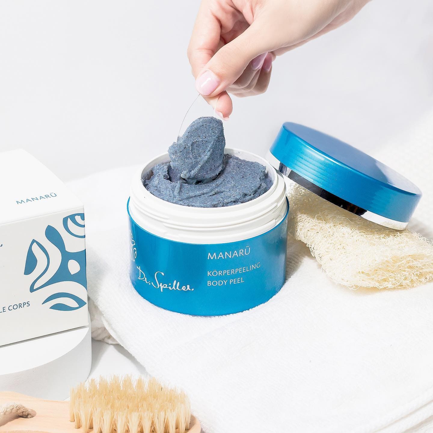 - тоніки з кислотами, делікатний крем-пілінг, як Manaru Body Peel, для покращення відлущування, оновлення верхнього шару (ензими, гранули з морською сіллю, PHA-, AHA-кислоти);