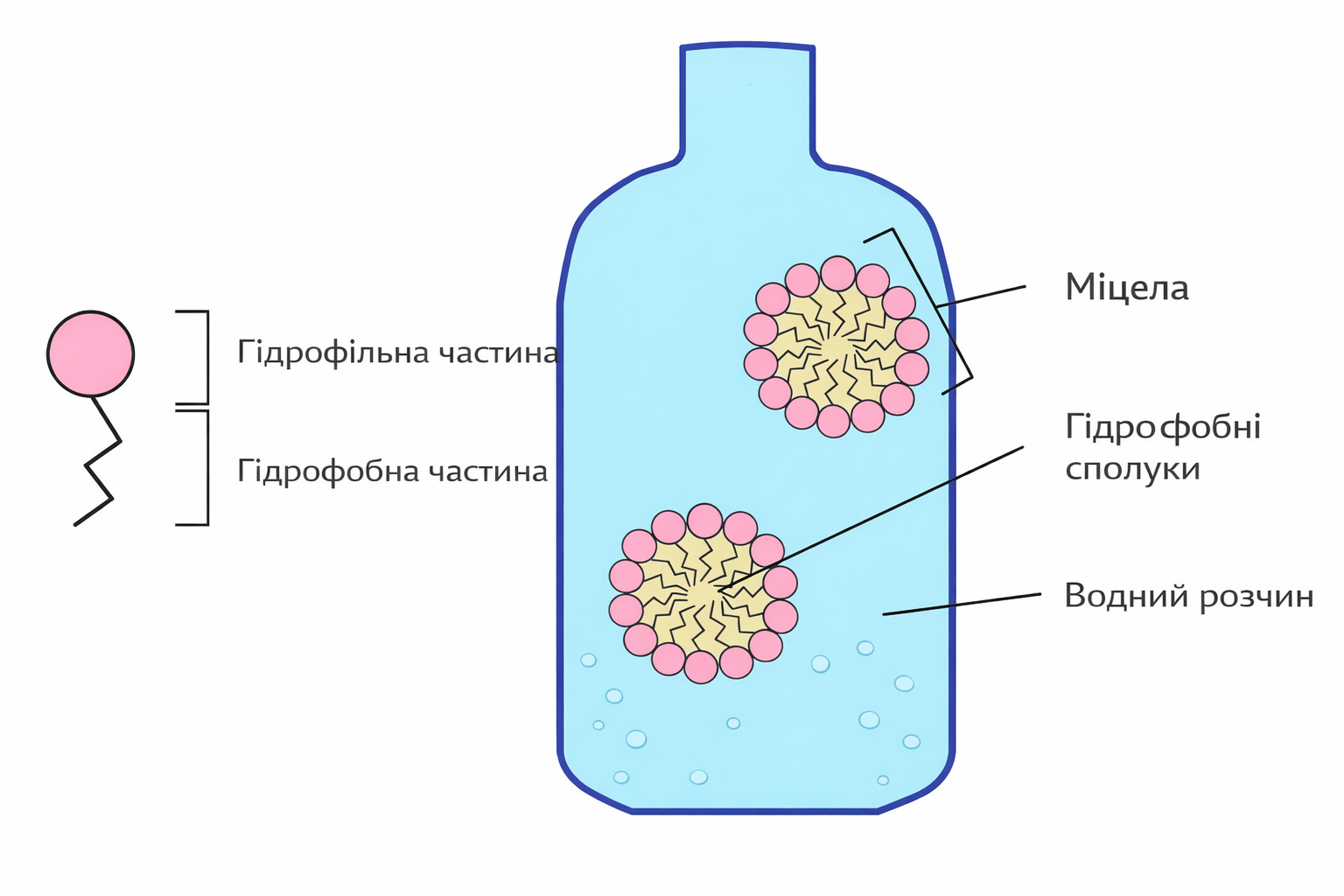 Отже, гідрофобна частка міцели захоплює шкірний жир, декоративну косметику на епідермісі, а гідрофільна сприяє їх легкому видаленню з поверхні. Схематично склад молекул виглядає так: