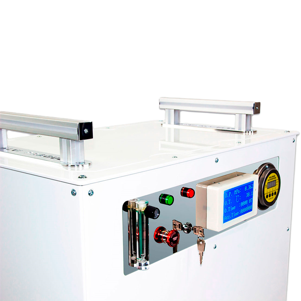 Усі ключові параметри роботи апарату, включаючи тиск газу, температуру кисневої суміші, тривалість процедури та загальний час роботи, контролюються автоматично і відображаються на дисплеї. Для забезпечення безпеки апарат оснащений захистом від перепадів напруги, системою аварійного оповіщення у разі перевищення робочих параметрів і кнопкою аварійного вимкнення.