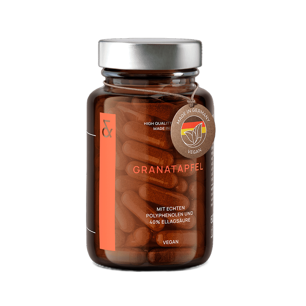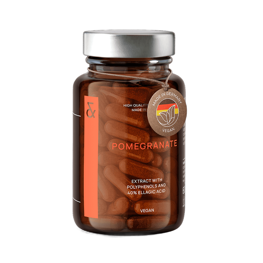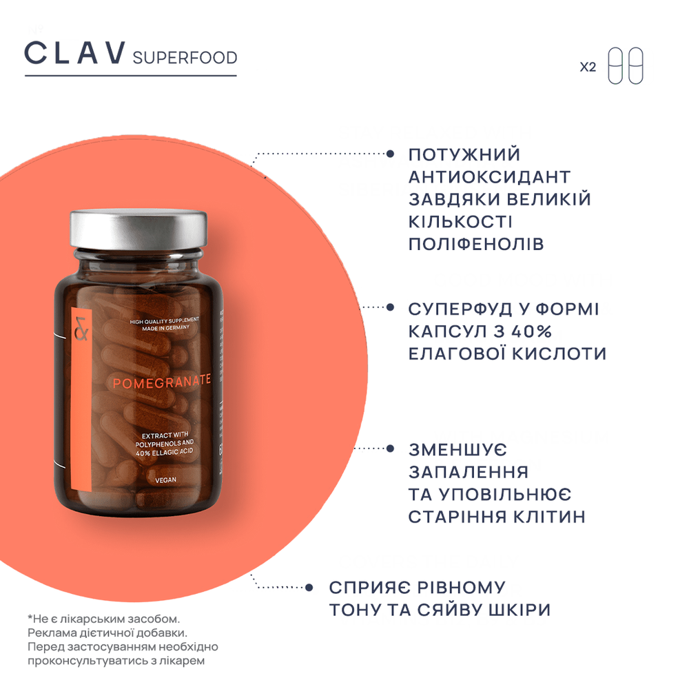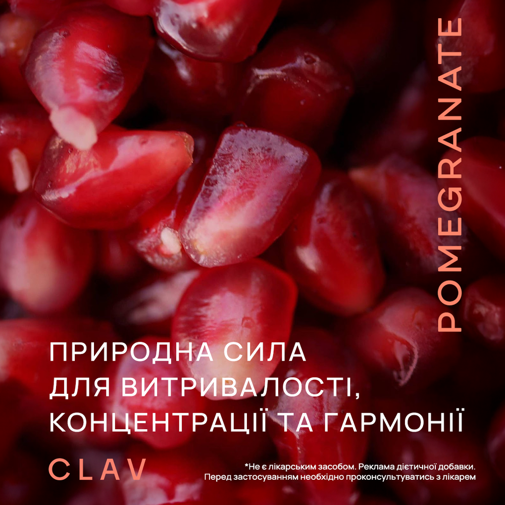 Дієтична добавка у формі капсул з екстрактом граната. Гранат — суперфуд та один із найпотужніших природних антиоксидантів. Його плоди містять цінні мінерали (кальцій, залізо, калій, магній), вітаміни групи B і фолієву кислоту, а також високу концентрацію антиоксидантів — вітаміну E та елагової кислоти. Елагова кислота — це поліфенол, який допомагає захищати клітини від оксидативного стресу, підтримує нормальне функціонування організму й сприяє збереженню молодості клітин. Кожна капсула Pomegranate містить концентрований порошок плодів і шкірки граната, збагачений 80 мг елагової кислоти, що забезпечує максимальний антиоксидантний захист та підтримку клітинного оновлення.