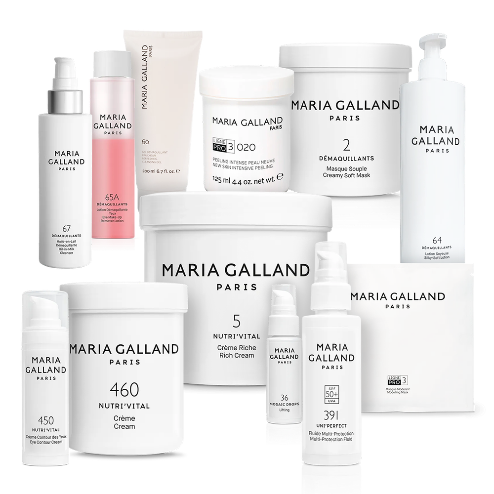 - Термоактивна моделювальна маска – 20-25 хвилин: захистити контури обличчя, шиї та декольте паперовою серветкою. Налити гумову миску 250 мл води 28°C. Додати вміст одного пакетика Masque Modelant 3, інтенсивно й ретельно перемішати за допомогою моделюючого вінчика до отримання однорідної пасти. Нанести маску на обличчя, шию та зону декольте за допомогою моделюючого аплікатора і скульптурувати за технікою Maria Galland Paris. Залишити маску для дії на 15 хвилин. У цей час зробити масаж рук за 936 Source D'Énergie Renaissance Hand Cream. Щоб зняти маску, потрібно попросити клієнта посміхнутися та обережно нахилити голову назад і вперед. Міцно тримаючи маску біля вух, взяти її цілим шматком і обережно зняти. Видалити її залишки та надлишки крему. Протерти шкіру добре віджатими вологими серветками, просушити.