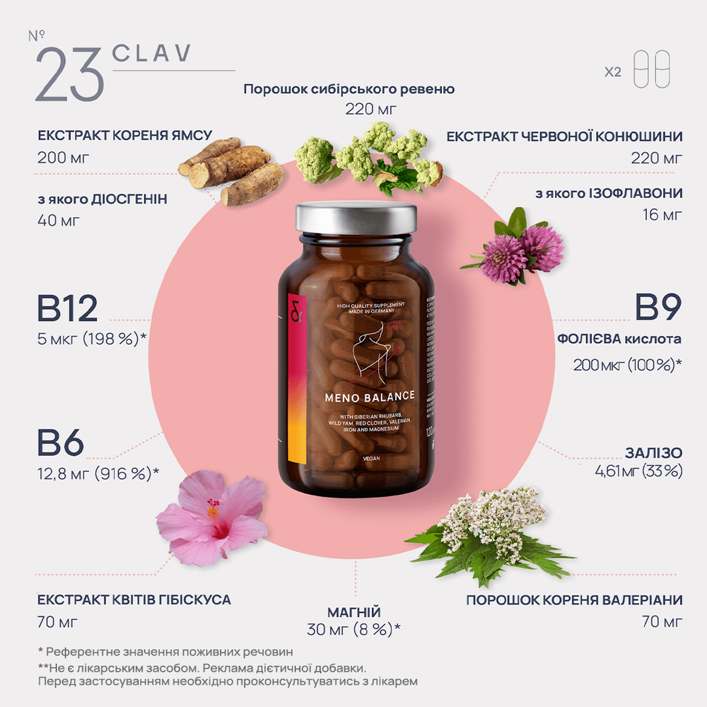 Дієтична добавка у формі капсул на основі рослинних екстрактів, вітамінів і мінералів, розроблена для підтримки жіночого організму в період менопаузи. Формула поєднує сибірський ревінь і червону конюшину, багаті на фітоестрогени, які діють як селективні модулятори естрогенових рецепторів — м’яко регулюють гормональний баланс, допомагаючи зменшити припливи, дратівливість і перепади настрою. Екстракт кореня ямсу, що містить діосгенін, сприяє природній підтримці рівня прогестерону, а валеріана допомагає впоратися з тривожністю та нормалізує сон. Комплекс доповнений вітамінами та мінералами, які підтримують рівень енергії, нормальний обмін речовин і загальне самопочуття під час гормональних змін.