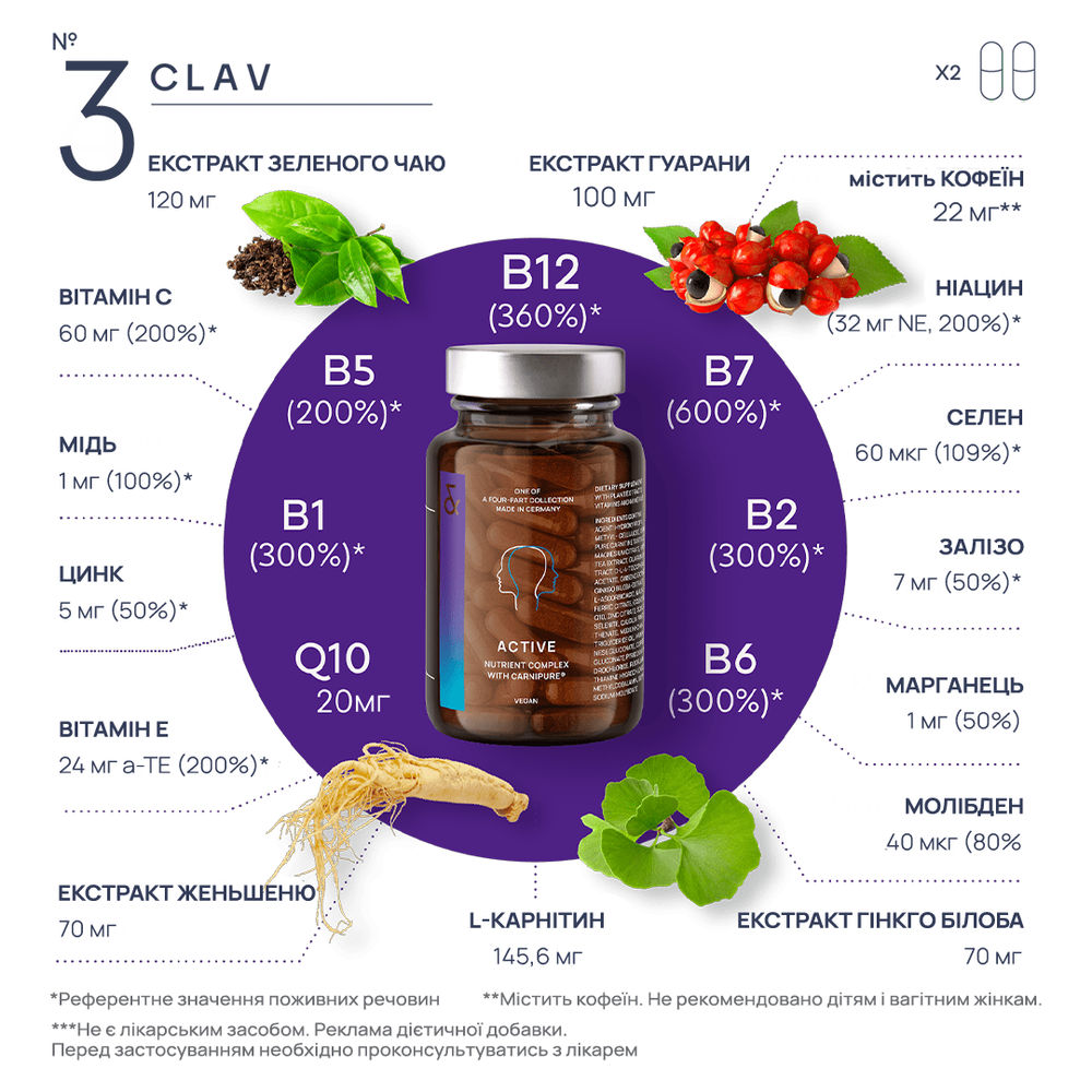 Дієтична добавка у формі капсул, рослинний стимулятор, який має такий самий підбадьорливий ефект як кава. Ретельно підібраний комплекс вітамінів B, що складається з вітаміну B2, вітаміну B5 (пантотенової кислоти), вітаміну B6 і вітаміну B12, у поєднанні з ніацином і залізом сприяє здоровому енергетичному обміну та зменшенню втоми й виснаження.