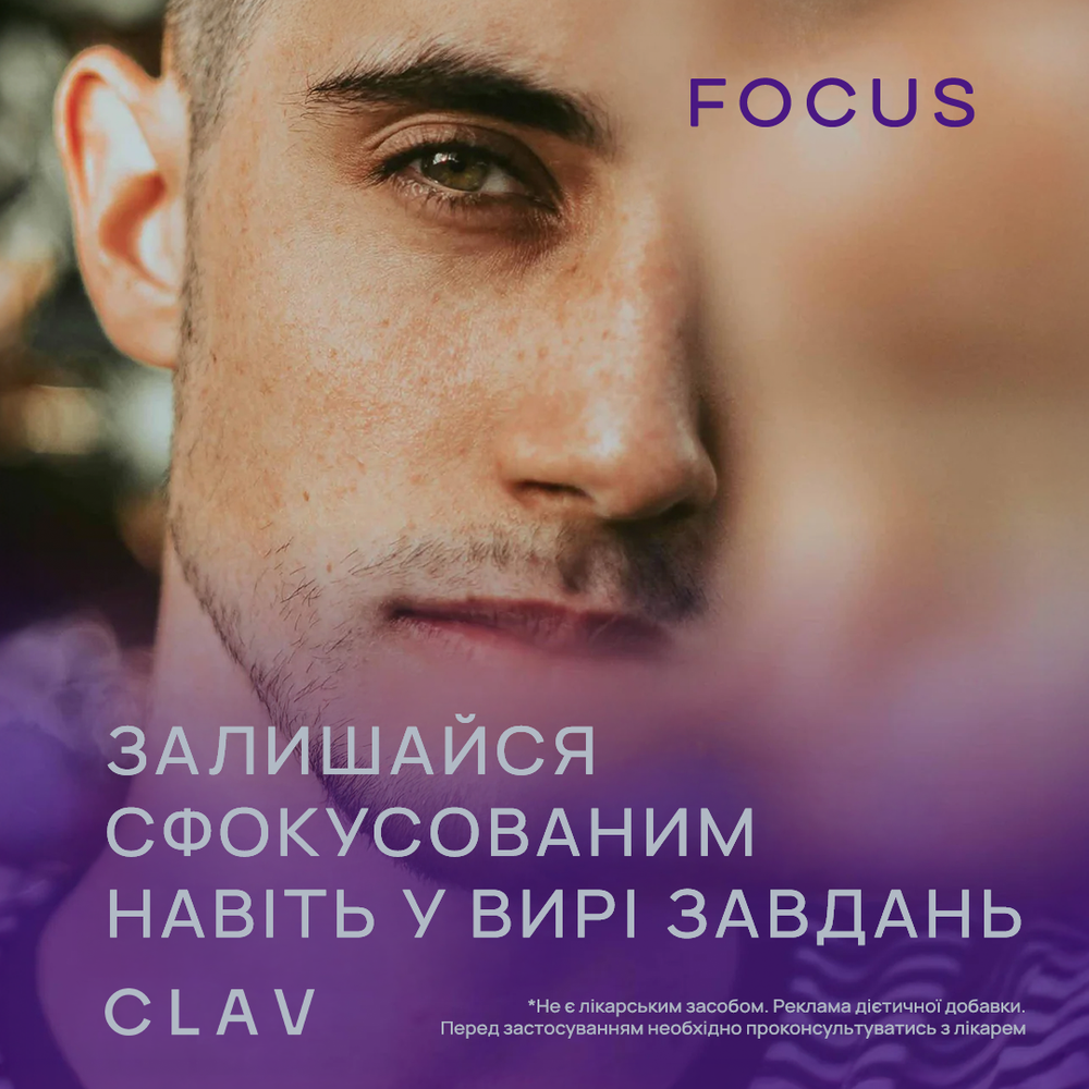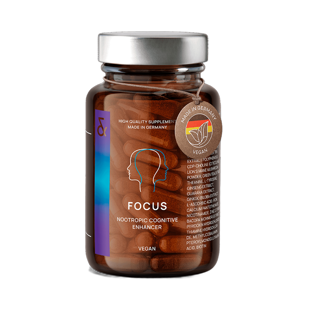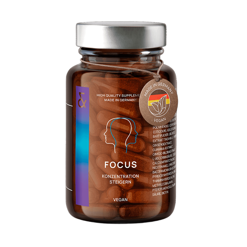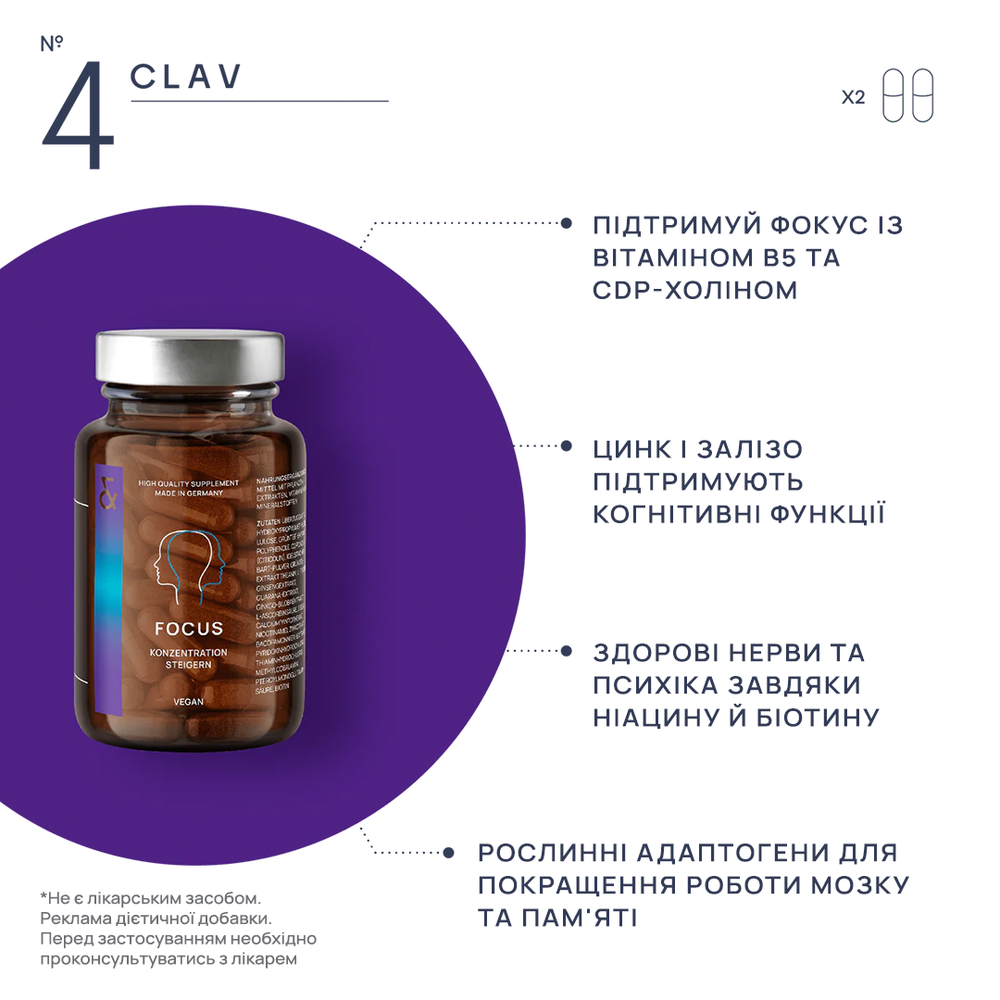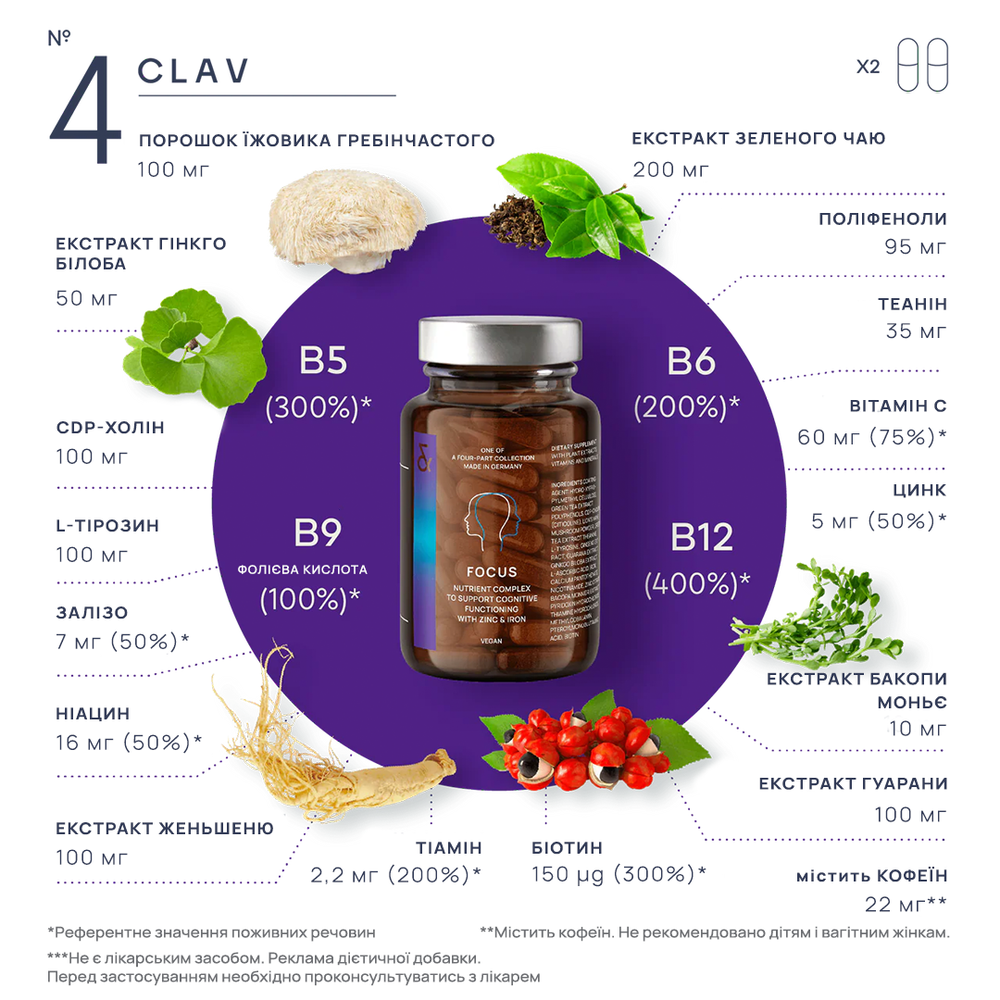 Дієтична добавка у формі капсул для підтримки розумової активності та концентрації. Такі мікроелементи як вітамін С, вітамін В12, вітамін H, тіамін і ніацин у поєднанні з залізом, пантотеновою кислотою і вітаміном В підтримують функції нервової системи та зменшують ознаки втоми. Екстракт гуарани містить кофеїн і є додатковим стимулятором. Цинк і залізо, підтримують когнітивні функції — процеси мислення та пам'ять. Натуральні рослинні речовини, зокрема гінкго білоба, бакопа моньє та CDP-холін (цитиколін), що традиційно використовуються в аюрведичній практиці, мають додаткові ефекти, що можуть позитивно впливати на ясність мислення, концентрацію уваги і пам'ять. Комбінація активних компонентів у FOCUS підтримує розумову продуктивність, допомагає зосередитися й ефективно працювати в умовах високого навантаження.