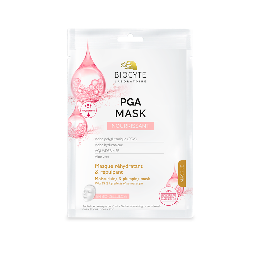 PGA Mask — це живильна маска на основі біоцелюлози, створена для інтенсивного зволоження й догляду за шкірою. Формула поєднує поліглутамінову кислоту (PGA), яка зволожує у 5 разів ефективніше за гіалуронову, з гіалуроновою кислотою, природними зволожувальними факторами (натрій PCA та лактат натрію), а також алое вера.