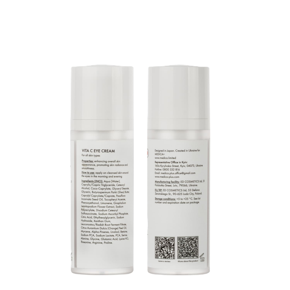 VITA C EYE CREAM активізує природні процеси оновлення шкіри, зміцнює захисний бар’єр і забезпечує тривале зволоження. Крем покращує еластичність і пружність ніжної зони навколо очей, освітлює темні кола, зменшує набряки й сліди втоми, допомагаючи зберегти молодість і свіжий вигляд.
